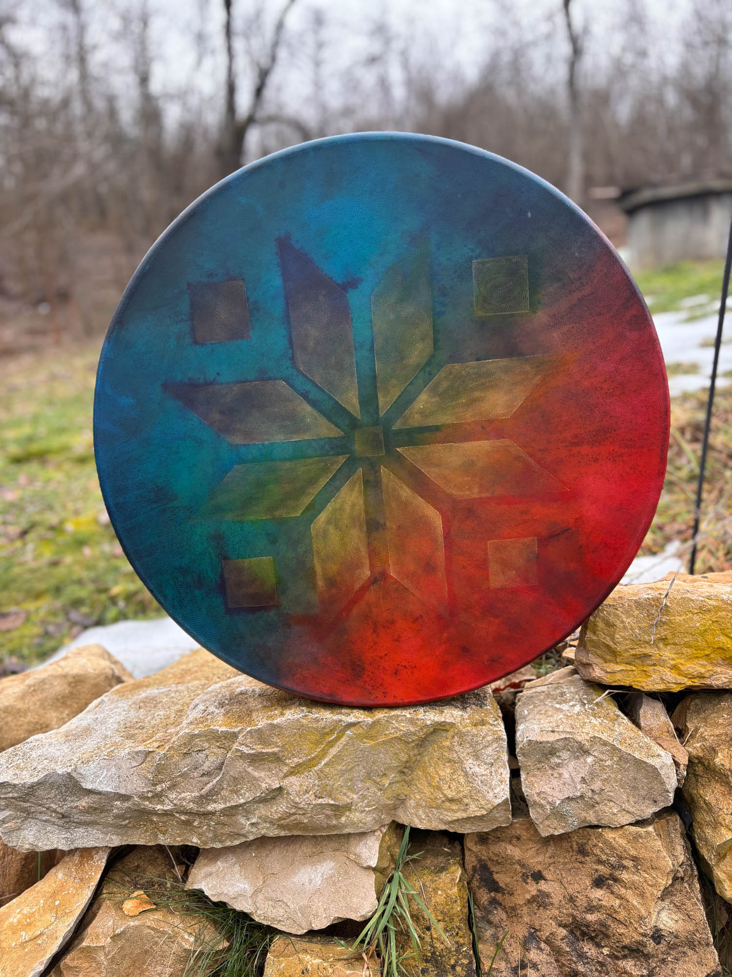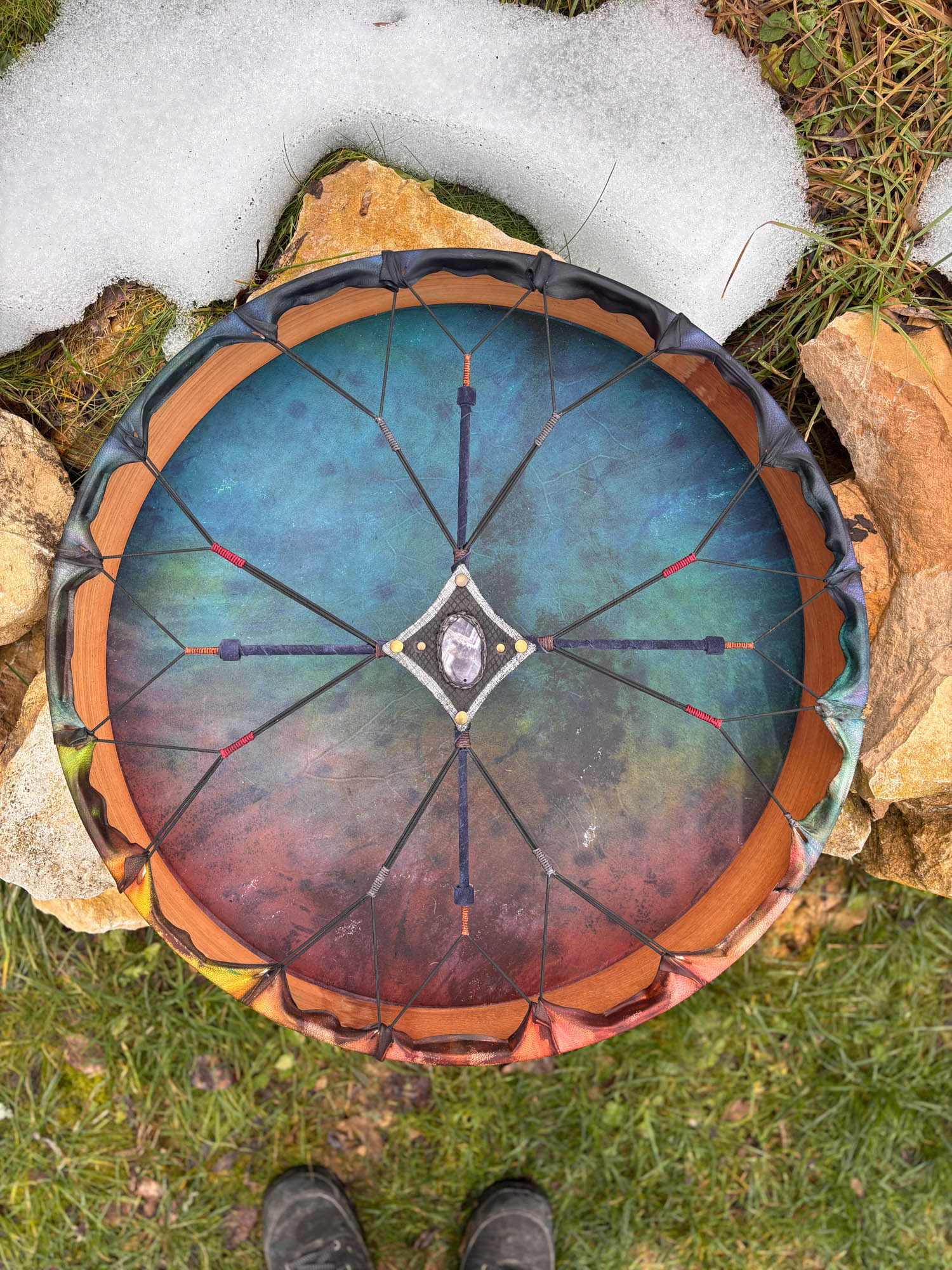 This is a 22″ Large Natural Goat Drum, 4″ Deep, produces a variety of low and high vibrations depending on how is tuned.