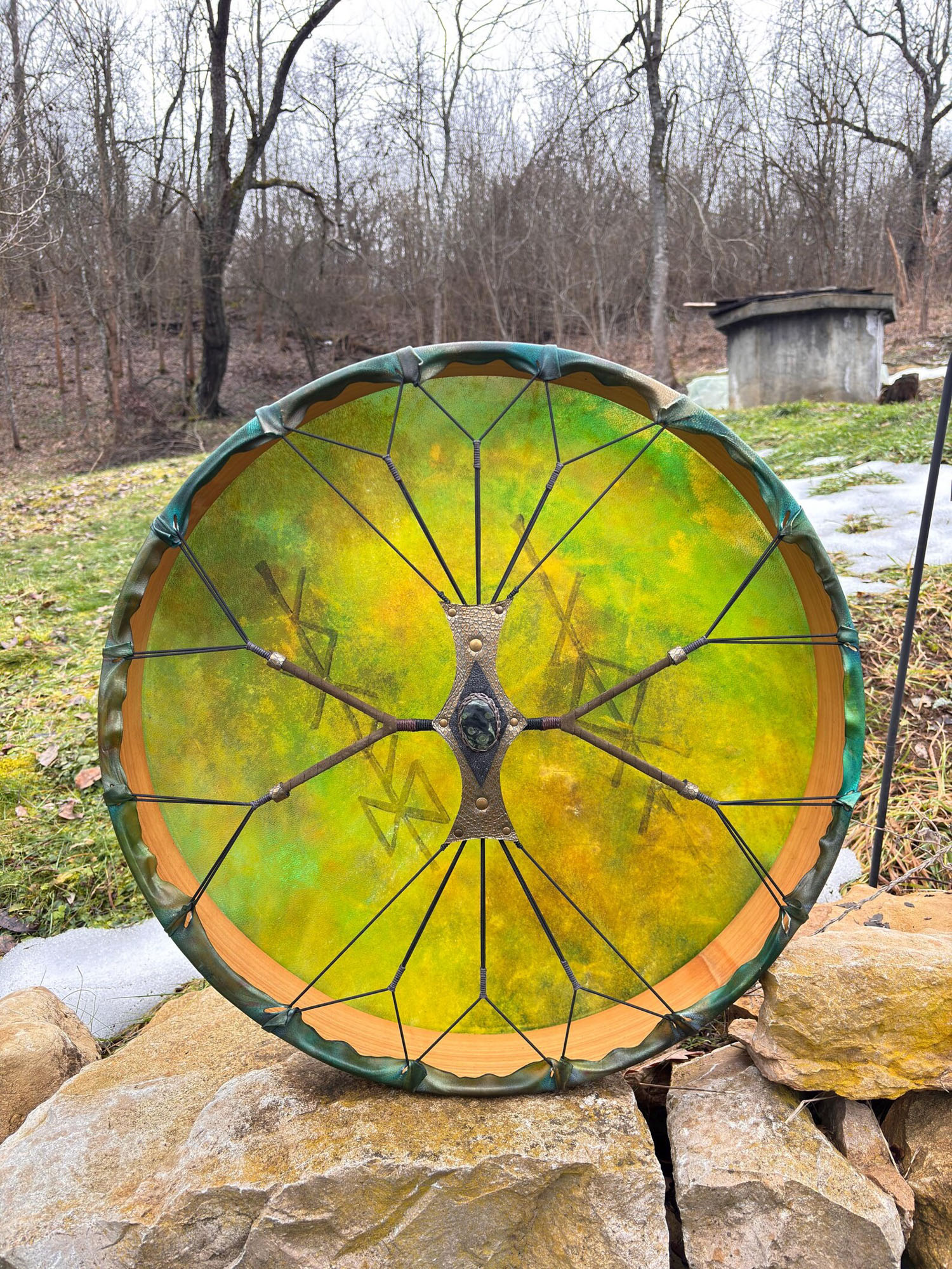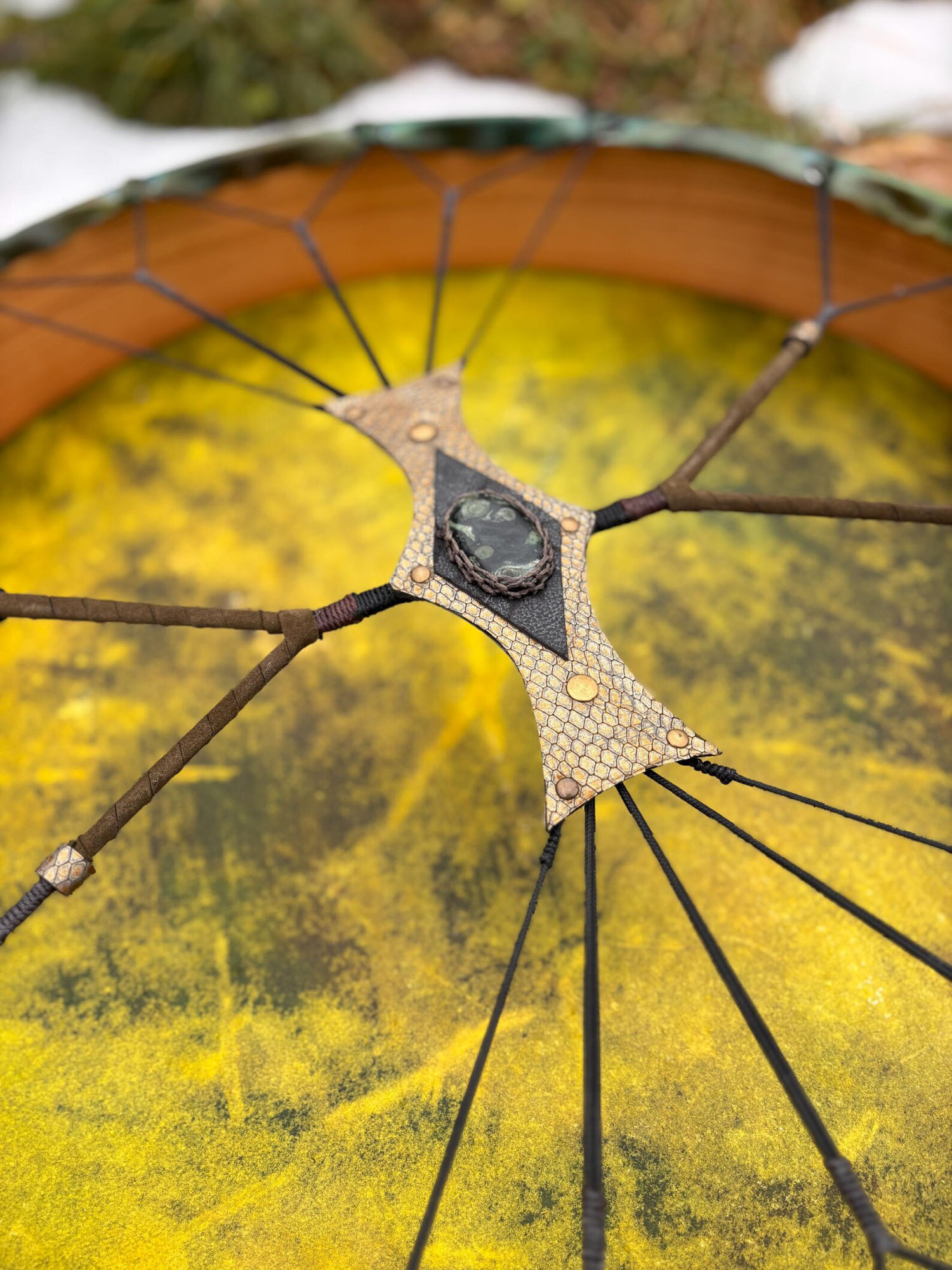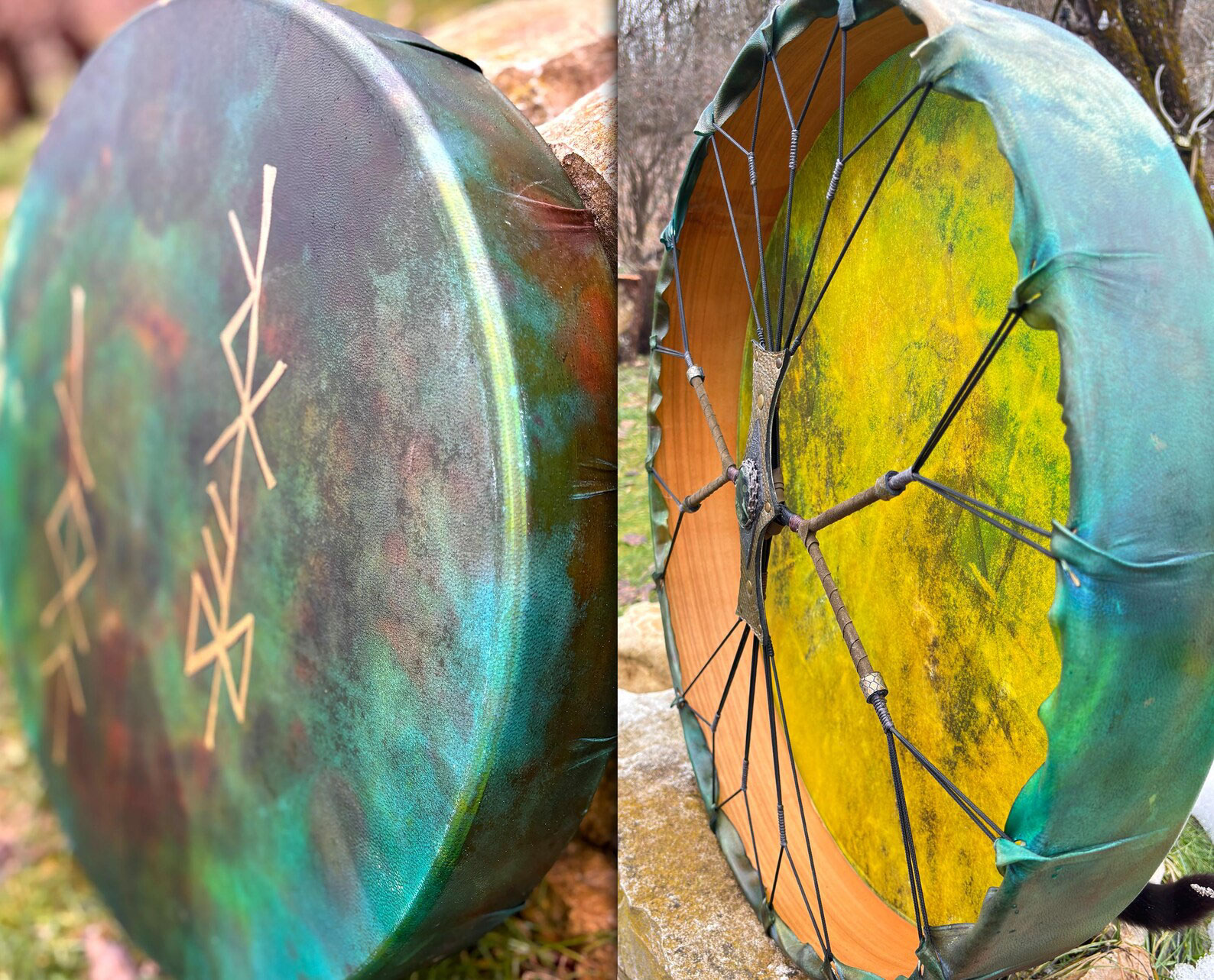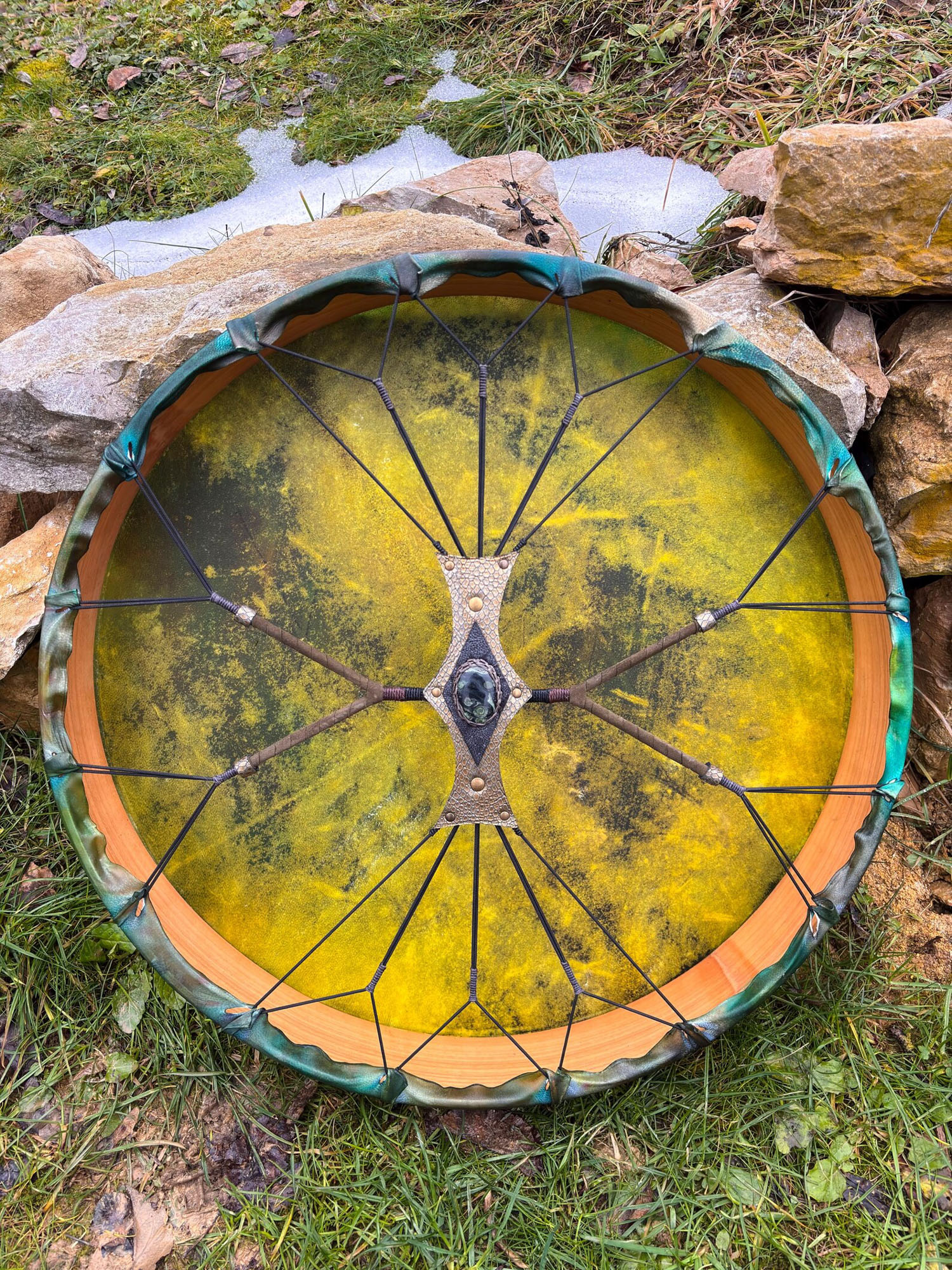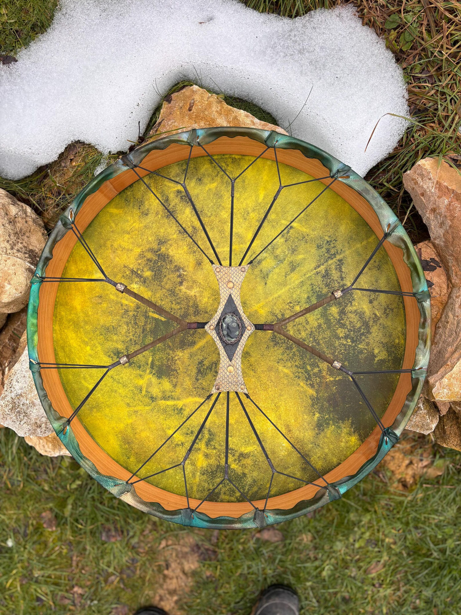 This is a 22″ Large Natural Goat Drum, 4″ Deep, produces a variety of low and high vibrations depending on how is tuned.