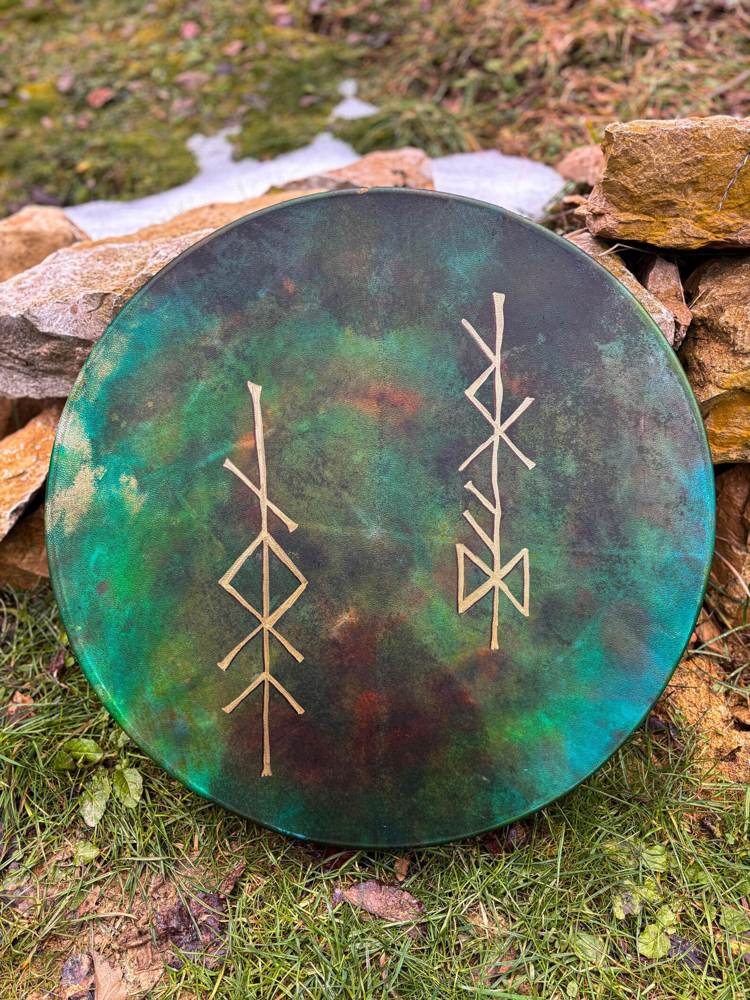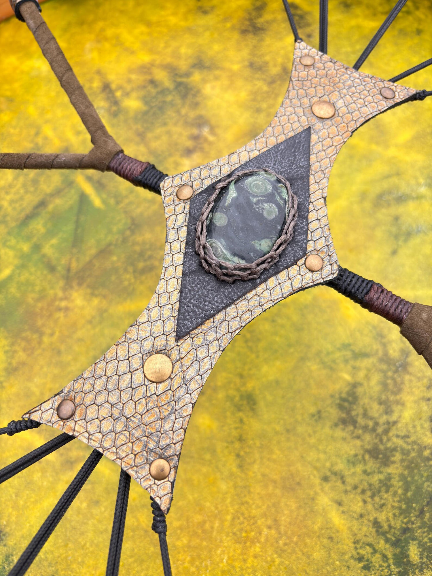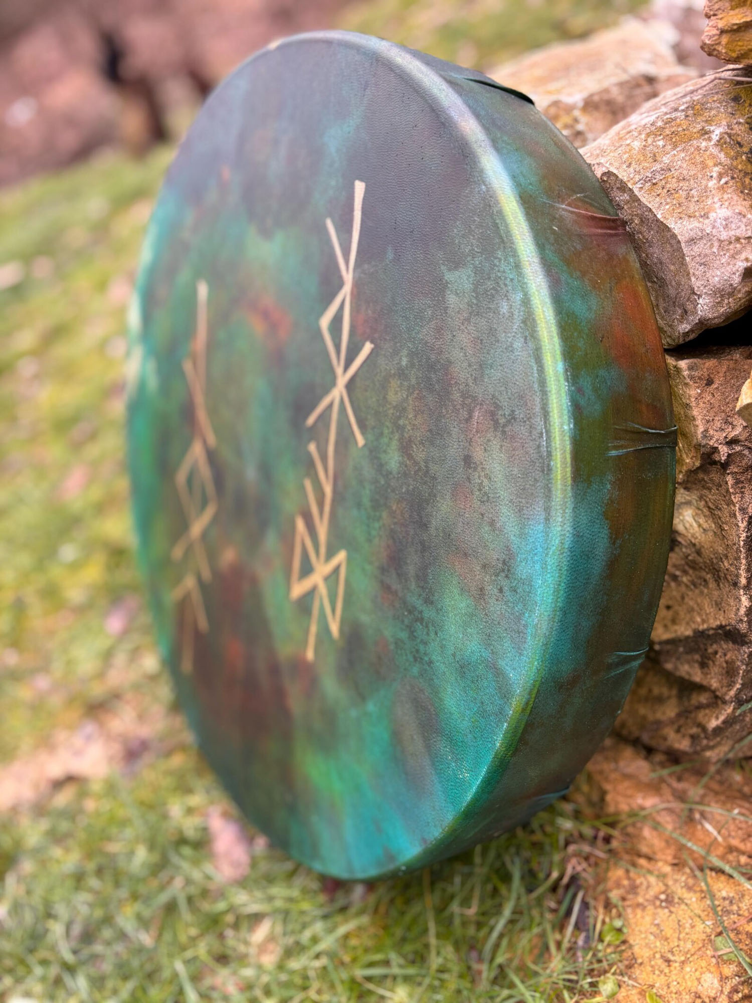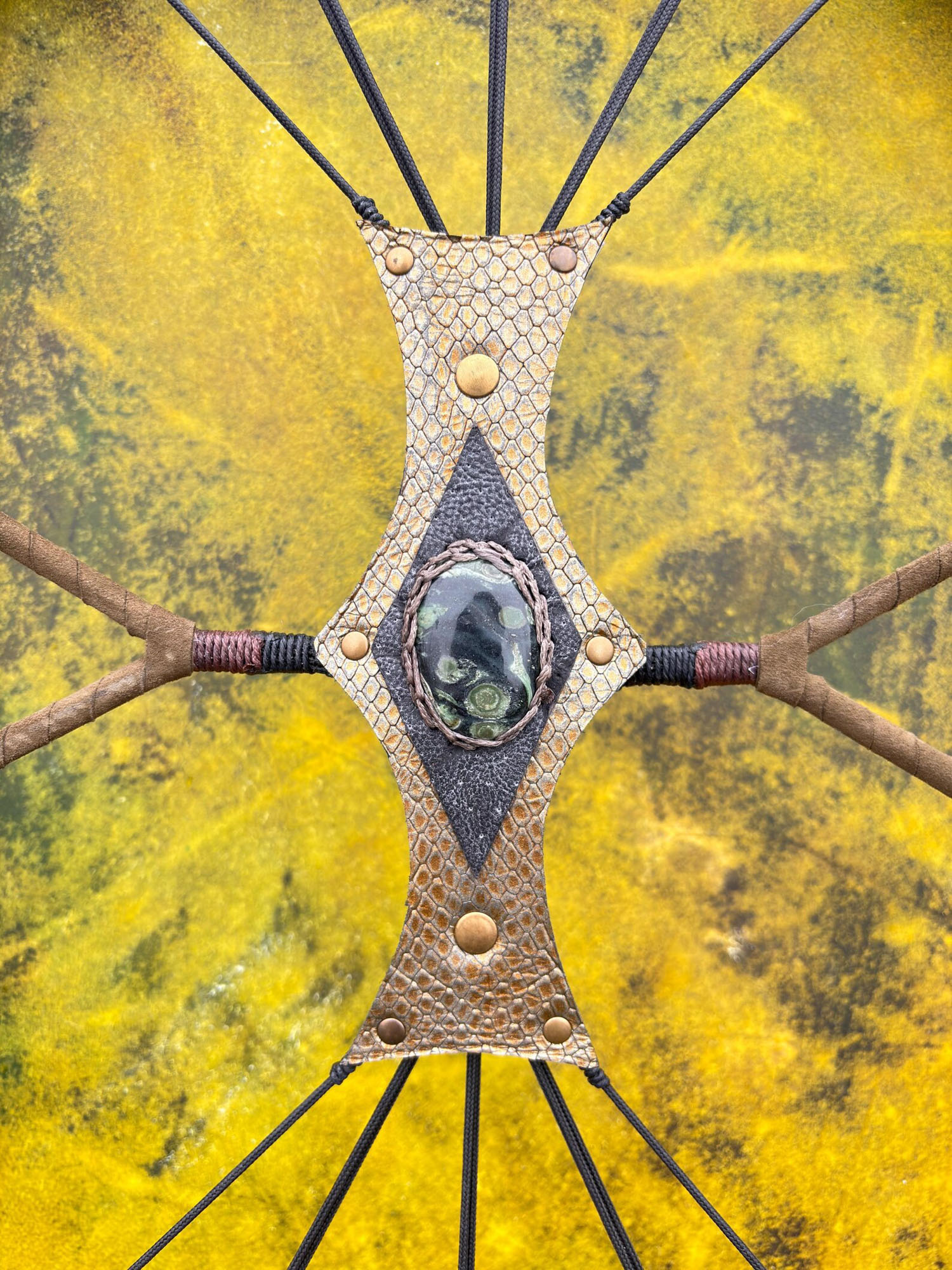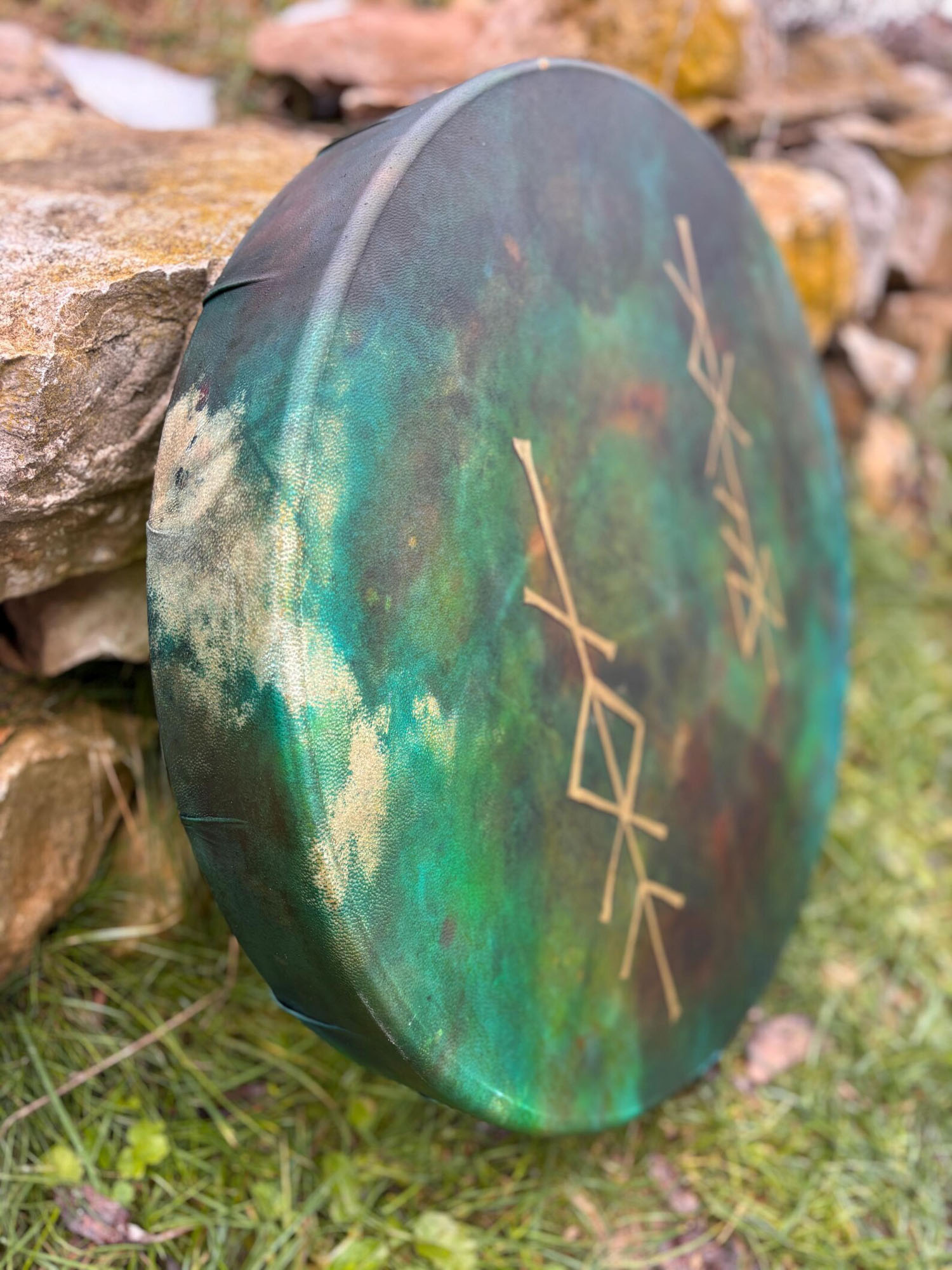 This is a 22″ Large Natural Goat Drum, 4″ Deep, produces a variety of low and high vibrations depending on how is tuned.